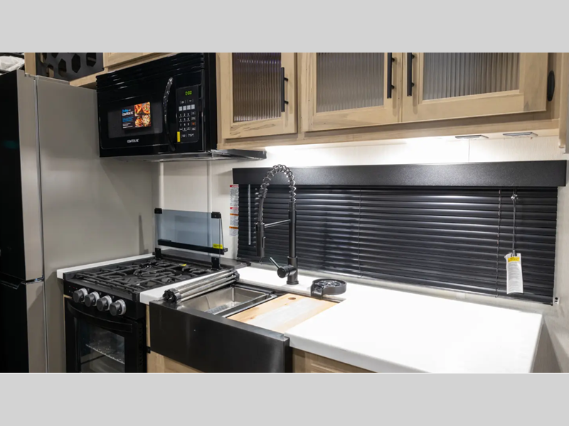 You will always find a comfortable place to relax with friends and family, cook with the full kitchen amenities, and clean up daily in the bathroom. There are also cozy sleeping spaces, plenty of storage options, and durable construction materials so you can enjoy your trailer for years to come!