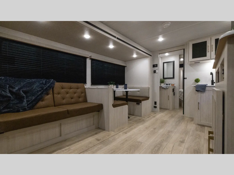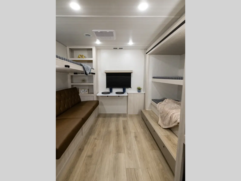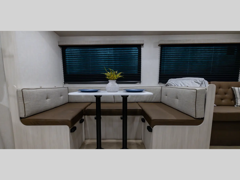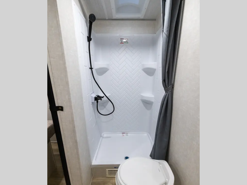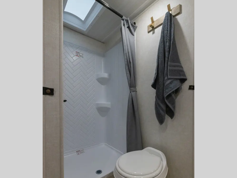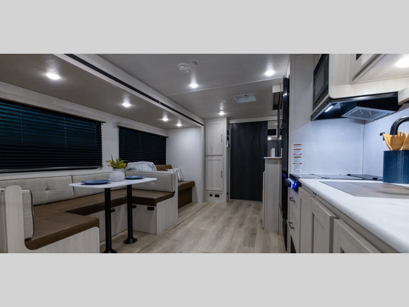 These travel trailers are extended season ready with a 2" aluminum framed floor and block foam insulation, plus there is a sealed underbelly with forced heat and radiant foil insulation. You'll love the Surf(X) seamless countertops throughout, and there is a tankless water heater for endless hot showers. Outside, a power tongue jack is ultra convenient and there is a hot and cold spray port to wash off hiking gear!