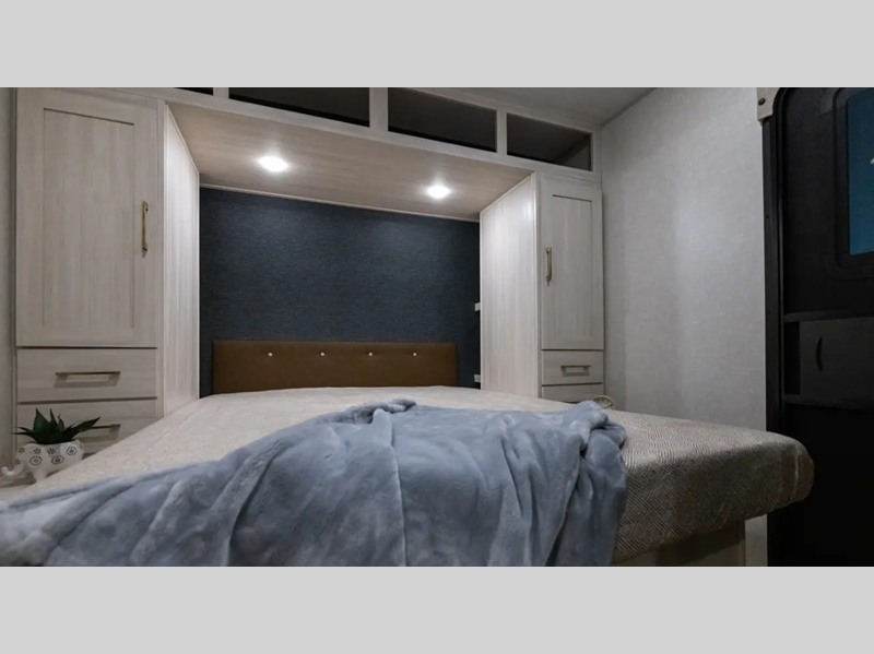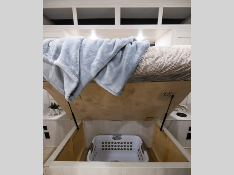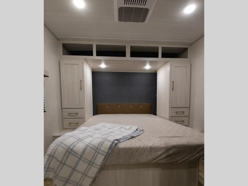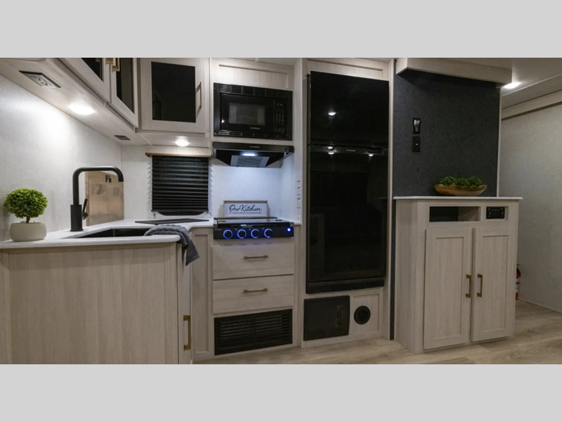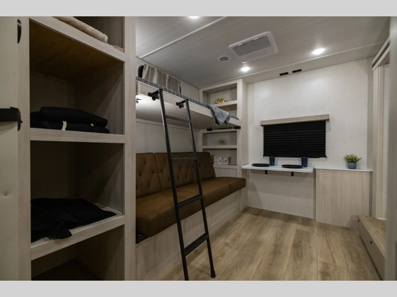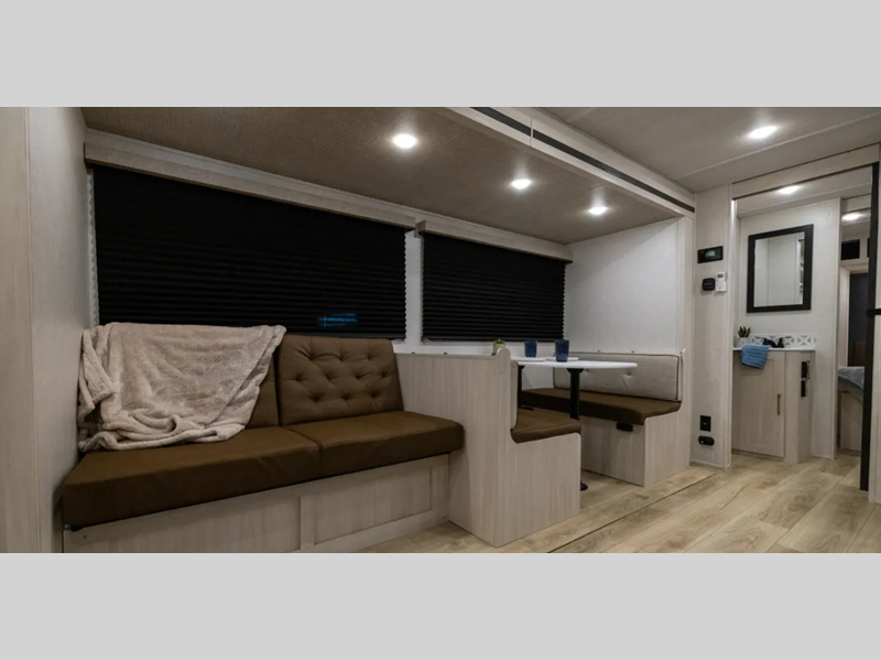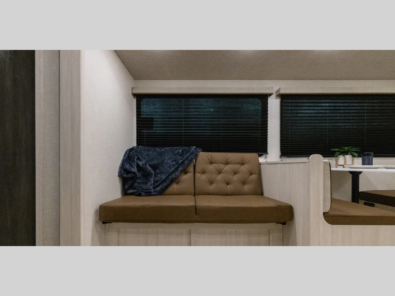 These travel trailers are extended season ready with a 2" aluminum framed floor and block foam insulation, plus there is a sealed underbelly with forced heat and radiant foil insulation. You'll love the Surf(X) seamless countertops throughout, and there is a tankless water heater for endless hot showers. Outside, a power tongue jack is ultra convenient and there is a hot and cold spray port to wash off hiking gear!