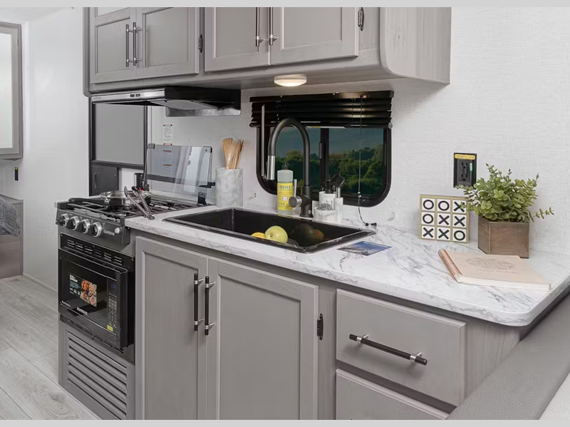 Sleeps 4 Slides 1 Length 26 ft 2 in Ext Height 11 ft 1 in Interior Color Pewter Furnace BTU 30000 btu Available Beds Queen Refrigerator Type 12V Refrigerator Size 10 cu ft Cooktop Burners 3 Number of Awnings 1 LP Tank Capacity 20 lbs Water Heater Type Tankless AC BTU 15500 btu Awning Info 16' Power Axle Count 2 Number of LP Tanks 2 Shower Type Standard Similar Floorplans
