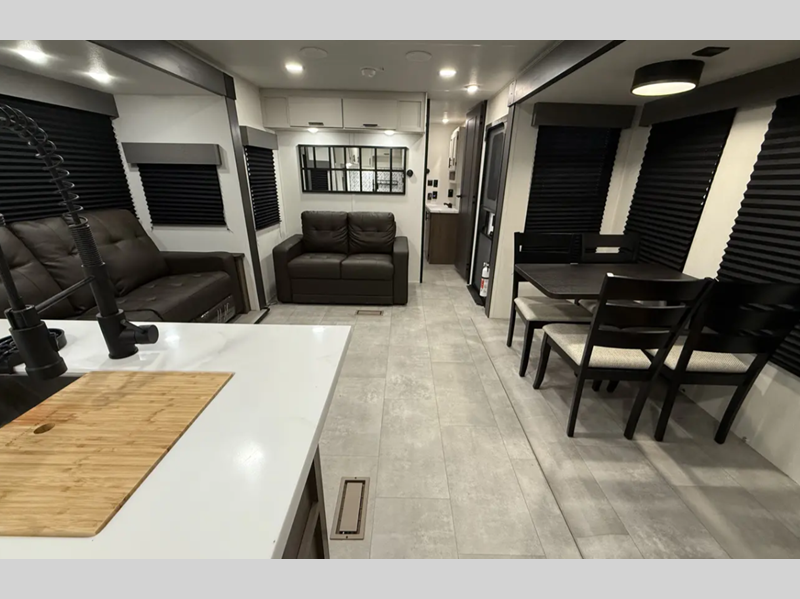 The exterior comes outfitted with welded aluminum framing, power awnings with LED lights, a fully enclosed underbelly, high density foam block insulation, Tufflex PVC Roof, and a tankless water heater. There are quite a few appliances that you'll find yourself using just about every day, like the Smart TVs, the soundbar, and 30" microwave oven for all of your cooking needs, plus two 15,000 BTU air conditioners so your inside temperature can keep your comfortable both day and night.