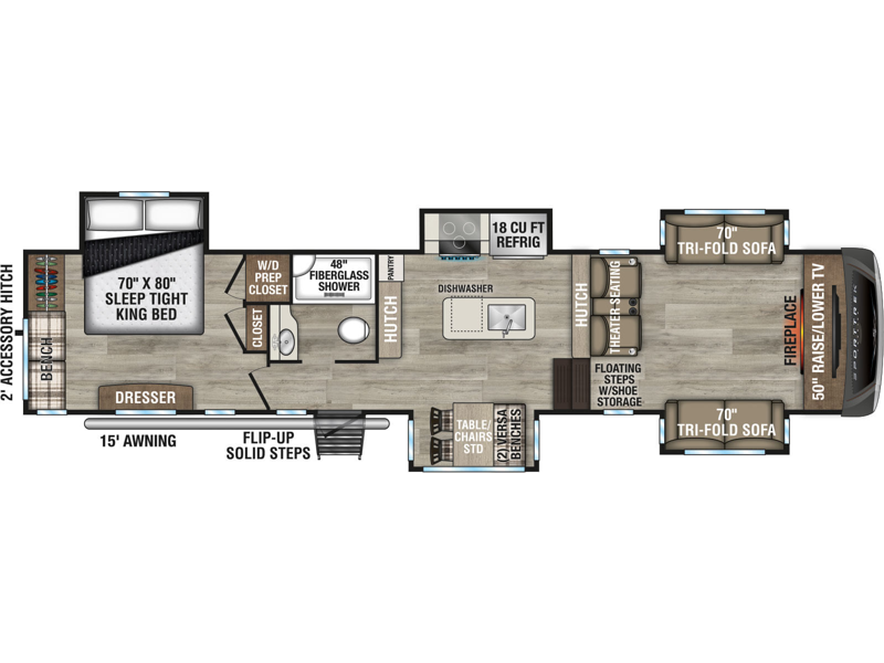 - Deluxe Tri-Fold Sofa & Theater Seats (Varies by Model) , King Bed Master Suite (Queen 343VBH/VIB)